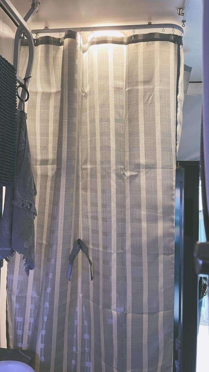 We removed the heavy shower door in our Jayco All Terrain 17.55-9.AT-MY22 poptop caravan and replaced it with a shower curtain. Amanda Sloane is a legend with a sewing machine and it ended up looking like it came from the factory that way.