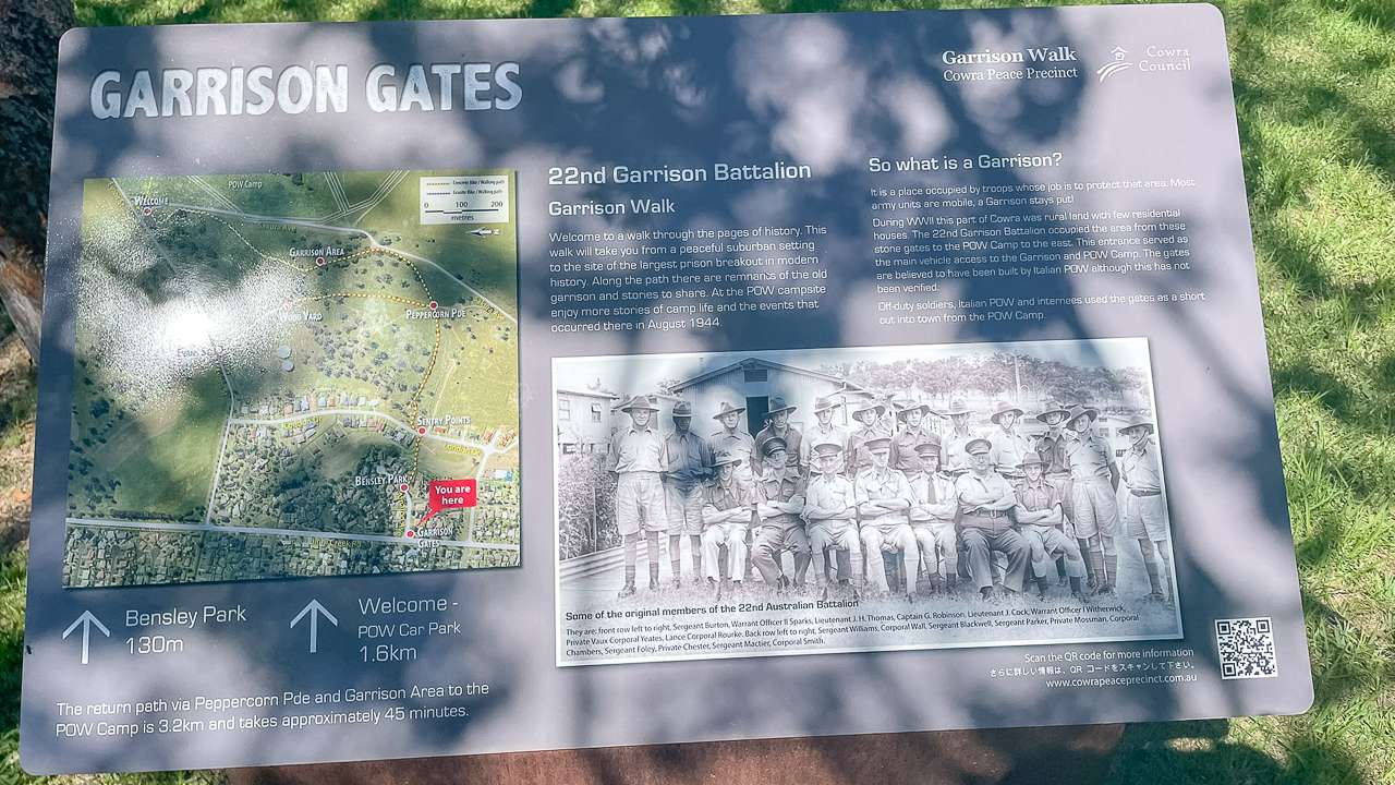 The gates are at the beginning of a walk that takes you from a peaceful suburban setting to the site of the largest prison breakout in modern history. Along the path there are the remains of the old garrison and boards with shared stories on them. At the POW campsite itself you can find many sign boards with stories of what happened here in August 1944.