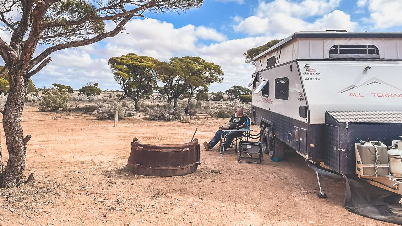 The first thing Amanda and I did was set up camp at the national park campground just a short walk from the homestead ruins. At $13 per night it’s a bargain and booking online was straightforward – although we suspect not everyone bothers. Make sure to book before you get to the Koonalda Homestead camping area as unless you have Starlink you won’t have an internet connection. The campsite is basic but well maintained with flat areas for tents and caravans and a few fire pits.